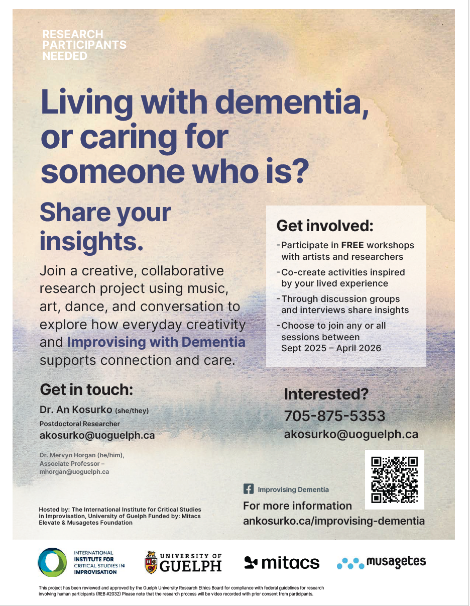 Our work is supported by the Musagetes Foundation and hosted by the International Institute for Critical Studies in Improvisation and the Department of Sociology and Anthropology at the University of Guelph.